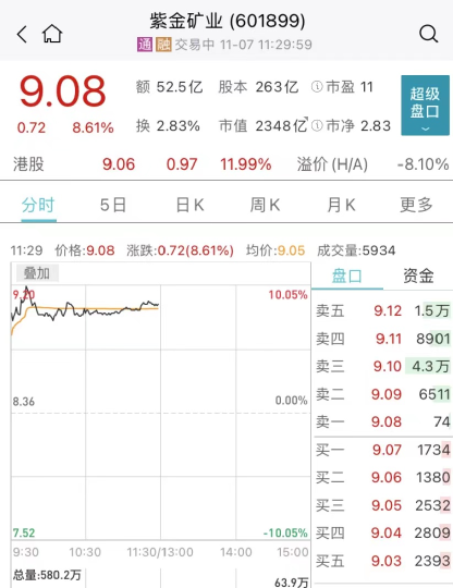 具体来看,紫金矿业领涨贵金属板块,紫金矿业A股一度触及涨停,成交额已突破52亿元高居两市榜首;H股暴涨12%。
