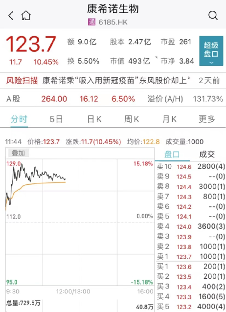 今日,康希诺AH股齐涨,港股康希诺生物一度涨超15%,A股康希诺一度涨超9%。
