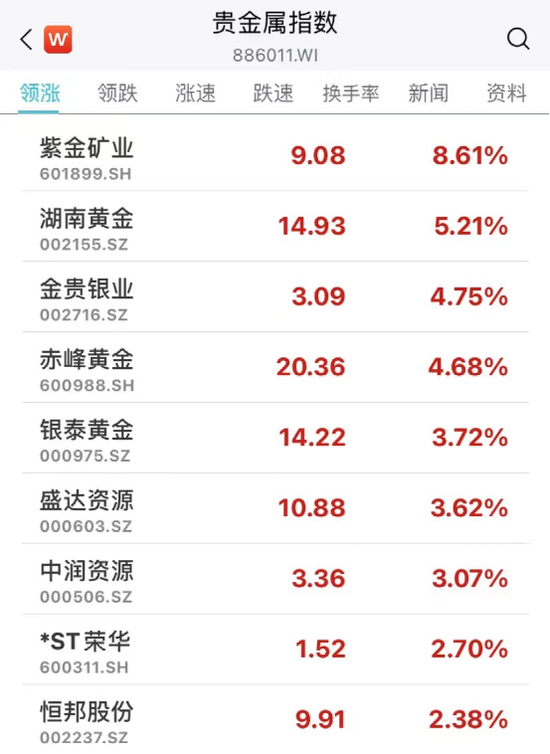 紫金矿业领涨贵金属板块