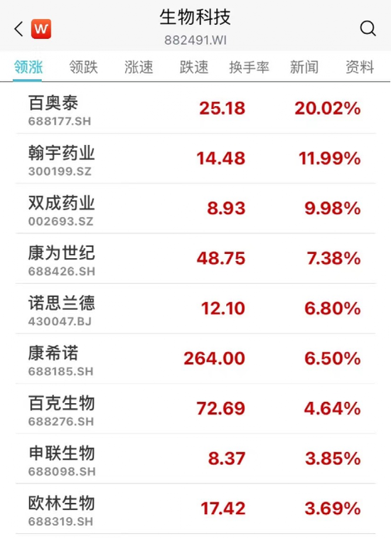 此外,生物科技板块拉升,百奥泰20%涨停,翰宇药业涨超12%,双成药业涨停,诺思兰德、艾迪药业、康辰药业等跟涨。