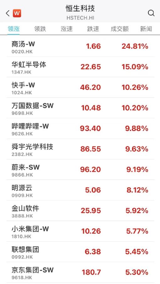 板块方面贵金属、稀土、软件、半导体等概念涨幅居前。商汤-W涨超24%,快手、万国数据、哔哩哔哩等多股涨10%。