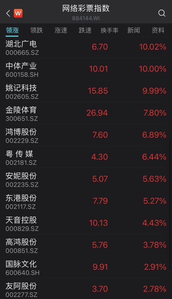 其次是互联网彩票板块,湖北广电、姚记科技等多股涨停。