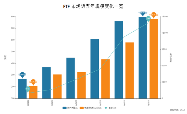 作为资产配置的重要工具,ETF市场近年来迎来了爆发性增长。以近五年的数据来看,Wind数据显示,2017年底,全市场共有145只ETF产品,合计份额为2276.87亿份,资产净值为3589.53亿元。