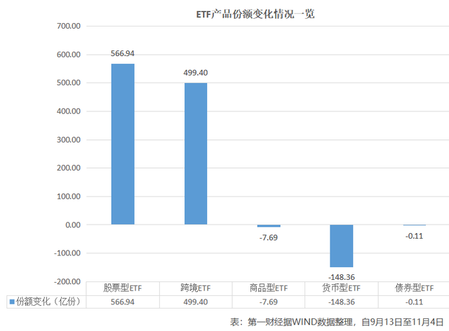 在市场震荡调整的背景下,不少ETF产品规模却逆势增加,受到资金青睐。Wind数据显示,9月13日至11月4日,全市场ETF产品份额增长了910.19亿份,其中商品型ETF、货币型ETF、债券型ETF均有不同程度的“缩水”,但股票型ETF和跨境ETF份额分别增长566.94亿份、499.4亿份,二者合计“吸金”1154亿元。