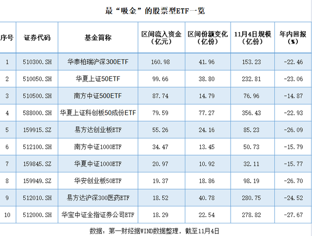 Wind数据显示,截至11月4日,全市场有470余只ETF基金份额较9月13日出现正增长,占比超过六成;基金份额合计增长超过900亿份。在基金份额逆势增加的ETF中,券商、医药、芯片、煤炭等行业ETF获得了较多资金的青睐。