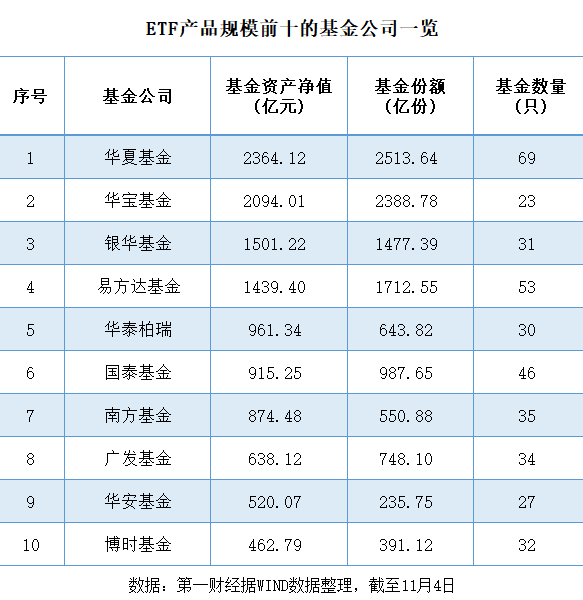 与此同时,记者也注意到,ETF市场的头部效应尤为明显。目前市场上共有54家基金公司布局ETF产品,规模排名前十位的基金公司的ETF产品资产净值合计达1.18万亿元,占总量的近八成。