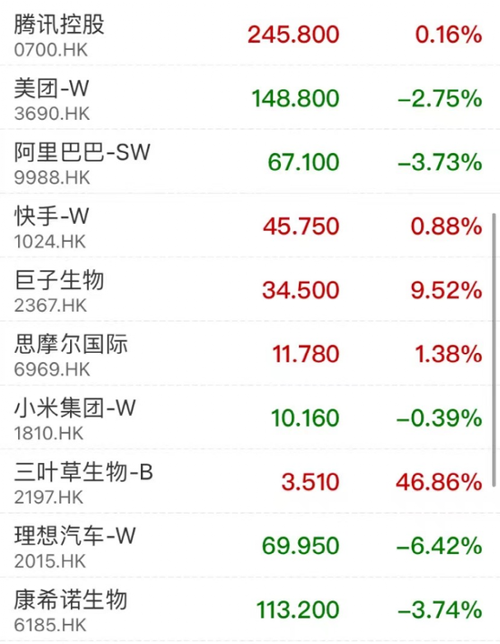 盘面上,科技股多数回调,阿里巴巴跌近4%领跌蓝筹,美团跌近3%,百度跌超2%;新能源汽车跌幅居前,零跑汽车重挫超13%,蔚来跌近9%,理想汽车跌超6%。医药股走势分化,三叶草生物盘中一度涨超90%,三度触发市场调节机制,收盘涨超46%,旗下新冠候选疫苗注册申请预计四季度完成;地产股走势低迷,银城国际控股跌约69%,龙光集团复牌跌超15%。