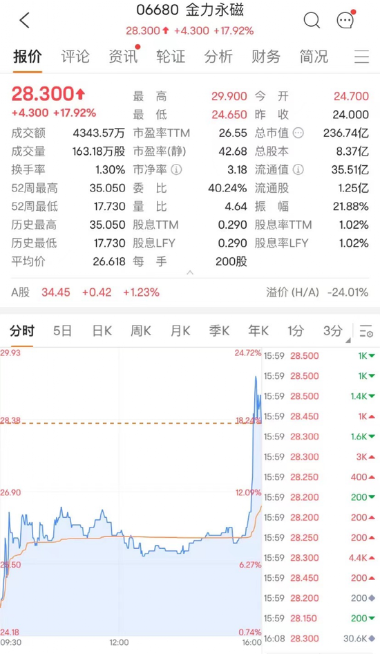 全球稀土永磁龙头金力永磁11月8日逆势上涨,尾盘飙升,最终收涨17.92%,报28.3港元/股,最新总市值236.74亿港元。