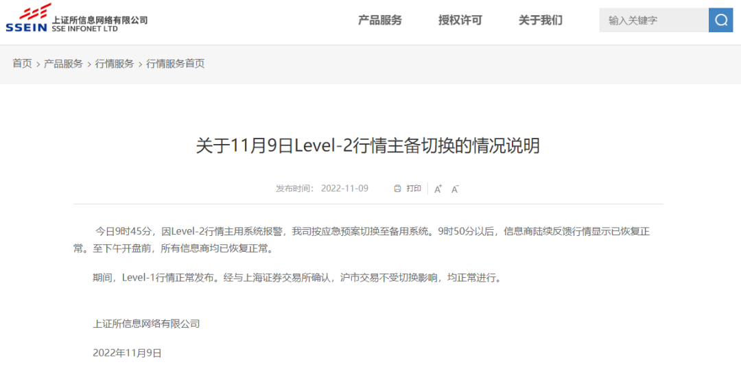 直到中午,上交所终于发公告解释称,今日9时45分,因Level-2行情主用系统报警,我司按应急预案切换至备用系统。9时50分以后,信息商陆续反馈行情显示已恢复正常。至下午开盘前,所有信息商均已恢复正常。期间,Level-1行情正常发布。经与上海证券交易所确认,沪市交易不受切换影响,均正常进行。