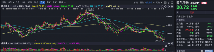 再说说盘面。今天市场最热闹的个股,无疑是歌尔股份,对市场的人气还是有一定打击。