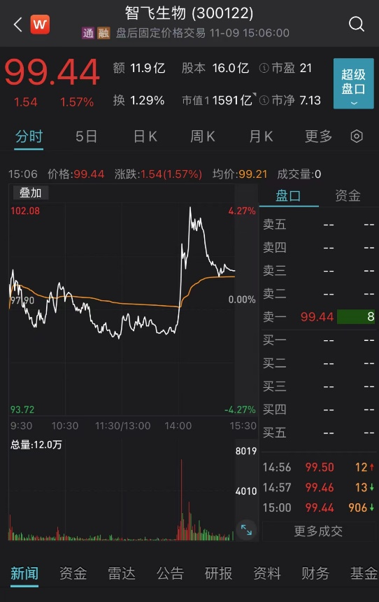 智飞生物盘中突发直线拉升,一度涨超4%,最新市值为1591亿元。