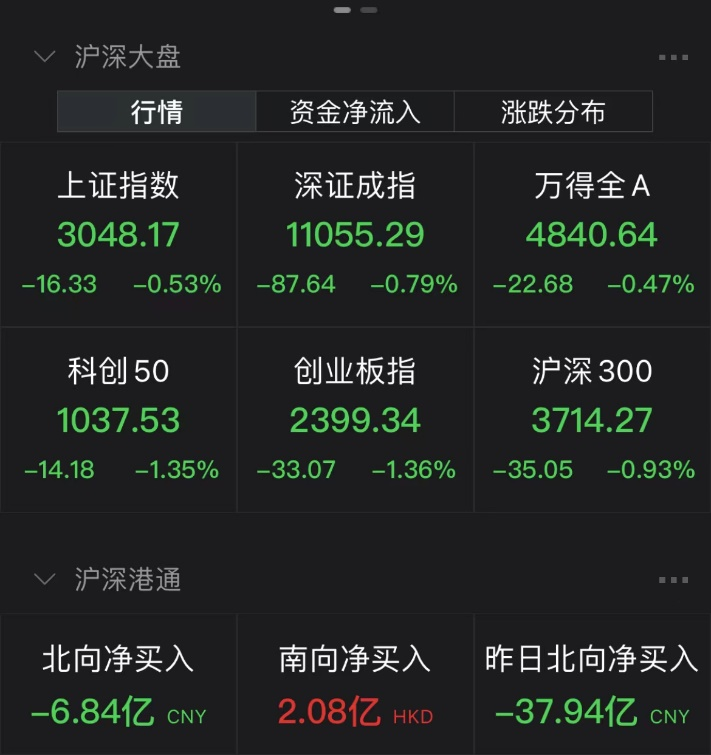 9日收盘,上证指数下跌0.53%,深证成指下跌0.79%,创业板指下跌1.36%,北向资金净流出6.84亿元,逾2000只个股上涨。两市成交额再度萎缩,约为7787亿元。