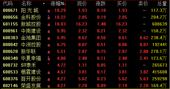 地产板块盘中发力走高,截至收盘,阳光城、金科股份、新城控股、中南建设等涨停,金地集团涨约7%,荣盛发展、招商积余涨逾4%。