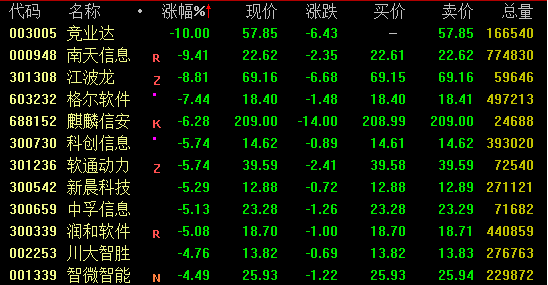 近日表现活跃的信创概念盘中回落走低,竞业达尾盘跌停,其它个股方面,南天信息跌9.41%,江波龙跌8.81%,格尔软件、麒麟信安跌超6%。