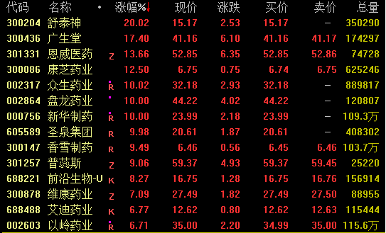舒泰神今日开盘后快速拉升封涨停,截至收盘,该股报15.17元,涨停板上封单仍有约6.6万手。