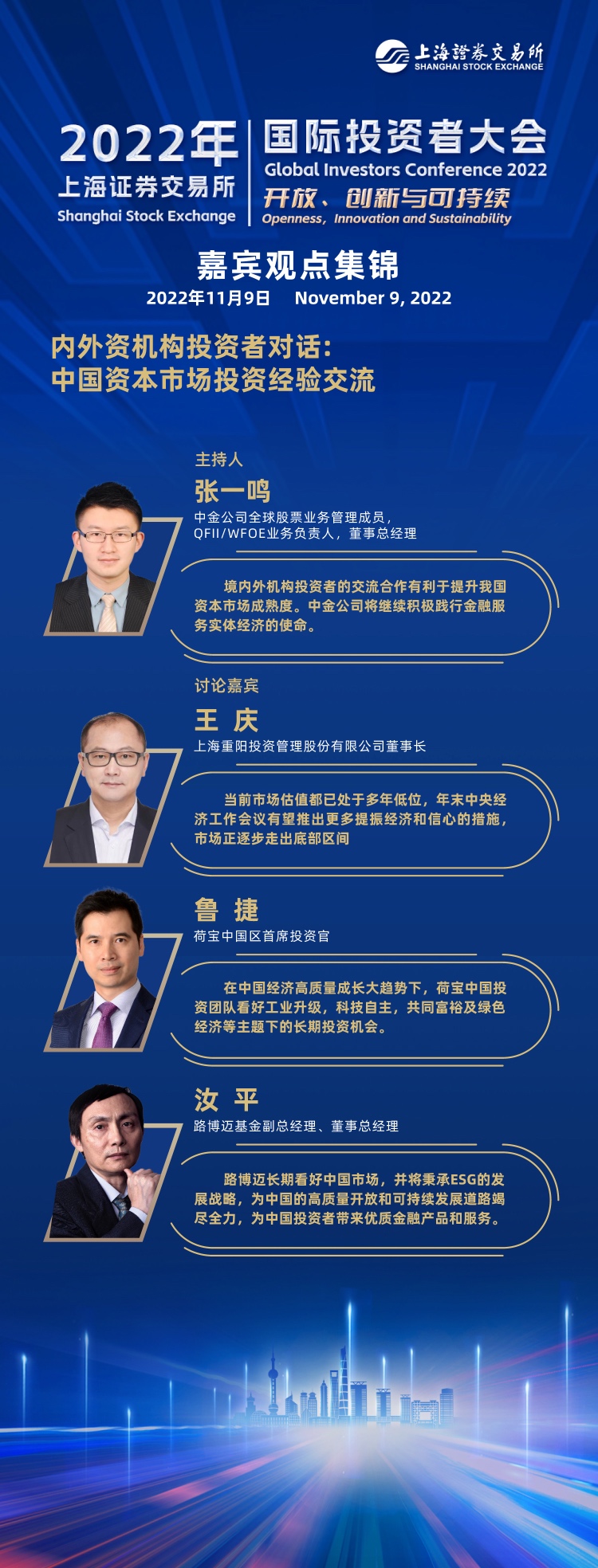 11月9日,2022年上海证券交易所国际投资者大会在沪开幕,中国证监会副主席方星海,上海市常务副市长吴清以视频方式致辞,上海证券交易所理事长邱勇现场致辞。本届大会以“开放、创新与可持续”为主题,汇聚近百位来自全球知名投资机构的重磅嘉宾,与逾千位国际投资者分享投资中国市场经验、传递长期看好中国理念。