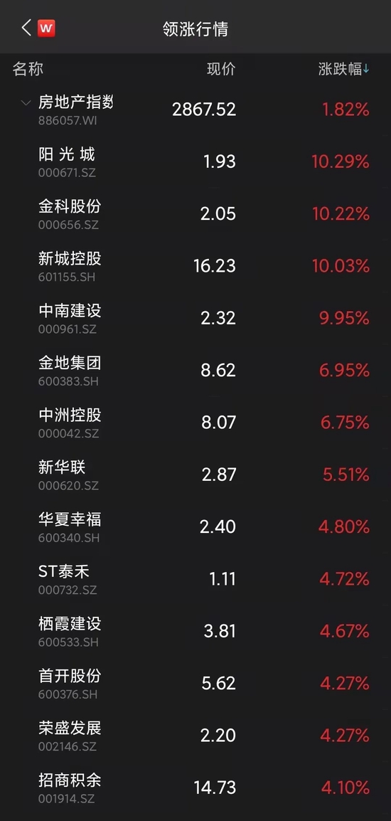 阳光城、金科股份、新城控股强势涨停,金地集团、中洲控股等纷纷走高。与房地产相关的物业管理、租购同权、建材等产业链个股纷纷上扬。