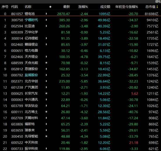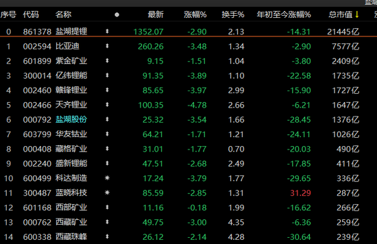 盐湖提锂跌近3%,比亚迪收跌3.48%报260.26元/股,盐湖股份、亿纬锂能跌近4%。