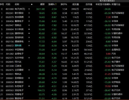 电子板块重挫,63只相关个股跌幅超过3%,恒铭达、长川科技跌幅超过7%,苏州固锝、赛微电子跌幅均超过9%,歌尔股份开盘跌停。电子市值一哥立讯精密跌逾5%报30.43元/股,年内跌幅扩至逾34%;北方华创跌近6%,紫光国微、三安光电、闻泰科技等个股也表现不佳。