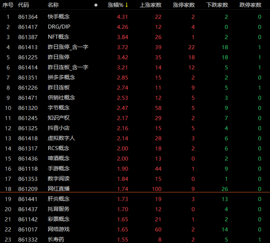 快手、NFT、拼多多概念领涨,供销社概念、字节概念、知识产权、手游概念、数字阅读、网红直播等逆市上涨,肝炎概念、长寿药、啤酒概念、乳业概念也表现不错。