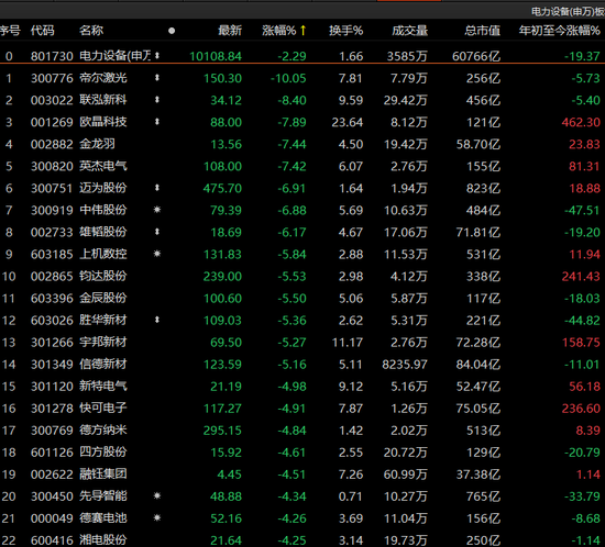 电力设备板块也表现低迷,14只个股跌幅超过5%,宁德时代收跌2.96%报385.3元/股,隆基绿能、阳光电源、恩捷股份跌幅均超过3%。