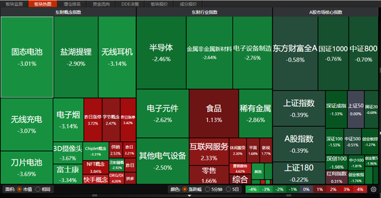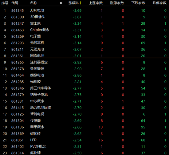 但电子、新能源、汽车等相关概念股大跌,刀片电池、3D摄像头、富士康、Chiplet概念、无线耳机、固态电池跌幅均超过3%;光刻胶、第三代半导体、中芯概念跌幅紧随其后;盐湖提锂、锂电池也表现不佳。