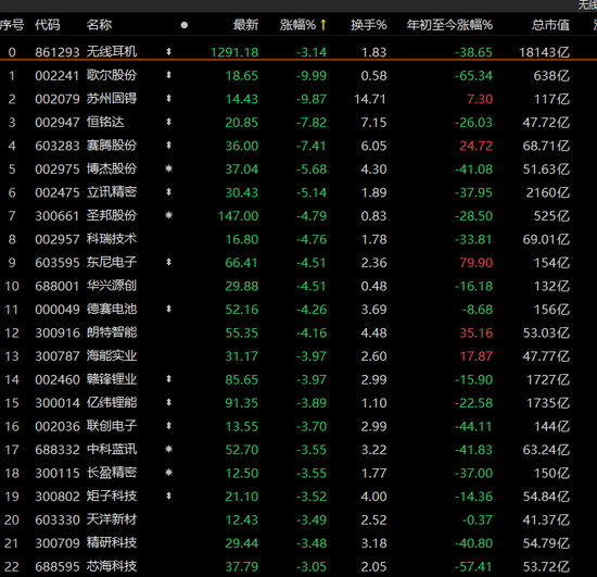 无线耳机概念重挫约3%,歌尔股份再次迎来跌停板。