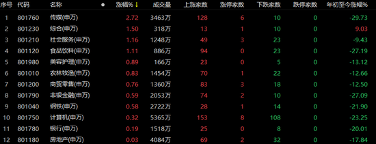 今日,大消费类板块逆市翻红,传媒更是涨近3%,社会服务、食品饮料、美容护理等板块涨约1%,银行、钢铁、农林牧渔板块也表现不错。