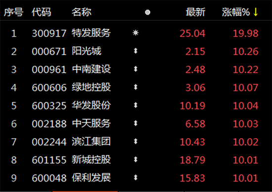 因近期支持民企融资的政策利好,地产股持续表现活跃,今日更是领涨A股,万科A、滨江集团、新城控股、三湘印象、天地源、广宇集团等十余只个股涨停。