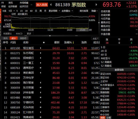 核心资产全面爆发,茅指数表现强势,大涨超3%。个股方面,恒立液压、东方雨虹涨停,招商银行大涨超7%,通策医疗、三一重工涨超6%。