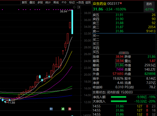 多只前期大牛股今天上演大跳水。其中,康希诺一度涨16%,收盘跌15.57%。众生药业午后两点从涨停板上跳水,短短20多分钟时间封上跌停,上演天地板行情。盘后龙虎榜数据显示,众生药业获深股通买入1.32亿元并卖出7760.96万元,2家机构净卖出2.27亿元。除了医药大牛股跳水外,信创牛股榕基软件此前一度连续4涨停,午后直线跳水,最终封上跌停板。