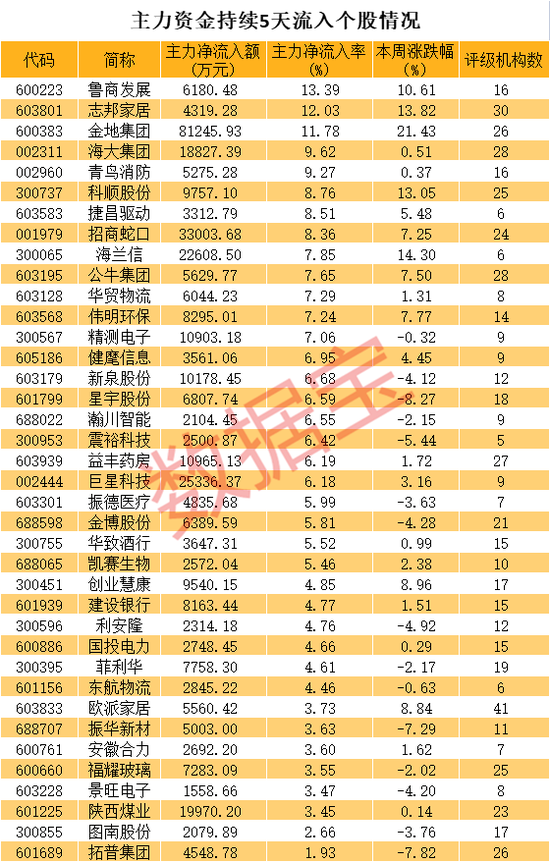 剔除次新股后,评级机构数5家以上的个股中,38只个股连续5天主力资金净流入。从主力资金净流入力度来看,鲁商发展、志邦家居、金地集团等个股主力资金净流入占比均超过10%。
