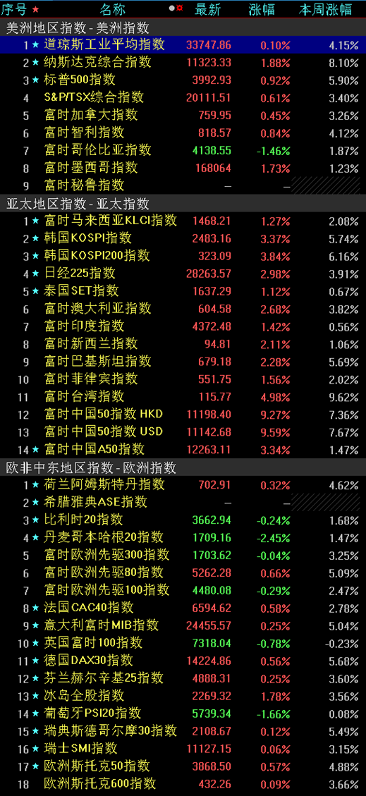 平安证券表示,全球股市明显回暖,美成长股领跑全球。美股三大指数本周均明显反弹。11月10日美国CPI数据公布后,超预期回落的10月CPI同比数据使得市场加息预期回落,风险偏好大幅升温,纳指当日涨幅便达到7%以上,创下2020年4月以来最大单日涨幅。欧股同样受到美国通胀降温带动的风险偏好回升影响,多数股指延续了上周的上涨趋势。