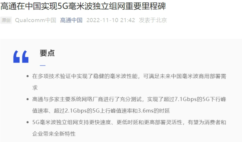 日前,高通公司宣布实现5G毫米波独立组网(SA)性能突破,在多项技术验证中实现了稳健的毫米波性能,可满足未来中国毫米波商用部署需求。