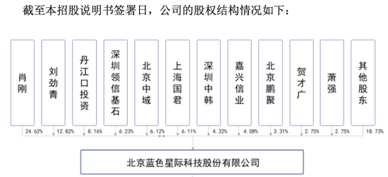 蓝色星际创立于2006年,创始人肖刚、刘劲青是一对夫妻,夫妇二人分别持有公司24.62%和12.82%的股权,作为一致行动人,合计持有公司37.44%的股权。肖刚同时担任公司董事长、总经理,刘劲青担任公司董事、副总经理、生产总监。