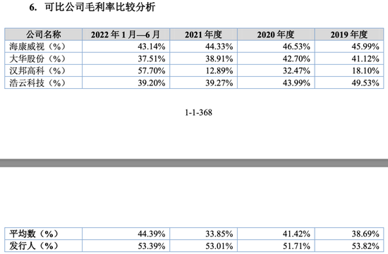 2019年-2022年上半年,蓝色星际毛利率分别是53.82%、51.71%、53.01%、53.39%;同一时间可比上市公司的平均毛利率分别是38.69%、41.42%、33.85%、44.39%。