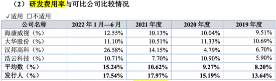 2019年-2022年上半年,蓝色星际的研发费用率分别是13.64%、15.19%、17.97%、17.54%;同一时间同行业可比公司的研发费用率平均值分别是8.2%、9.27%、10.62%、15.24%。