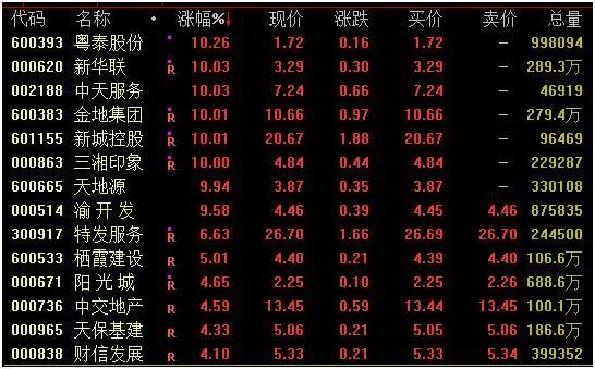 地产产业链股盘中强势拉升,截至收盘,粤泰股份、中天服务(维权)、金地集团、新城控股等涨停,特发服务涨近7%,万科A涨4%。