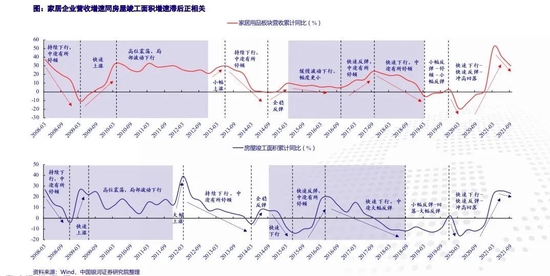 从营收和估值的角度,我们也来复盘一下历史,从2008年以来,房屋竣工面积累计同比增速出现大规模变化后,家居板块也同步有这样的变化。时间上是有滞后的,基本上趋势都是非常一致。时间上来讲,一般从销售到装修可能大概需要1-2年的时间,竣工到装修的需求一般都是滞后3个月左右。说明我们家居板块还是非常依赖地产的销售以及竣工的情况。