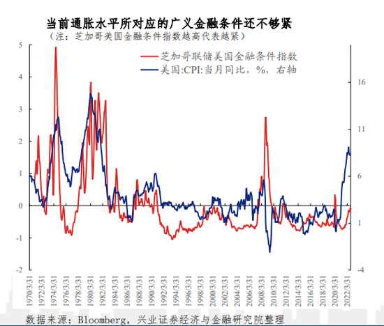 现在来看,治理这轮通胀还需要出重手。跟历史相比,美国广义金融条件的收缩还没有足够的限制程度。