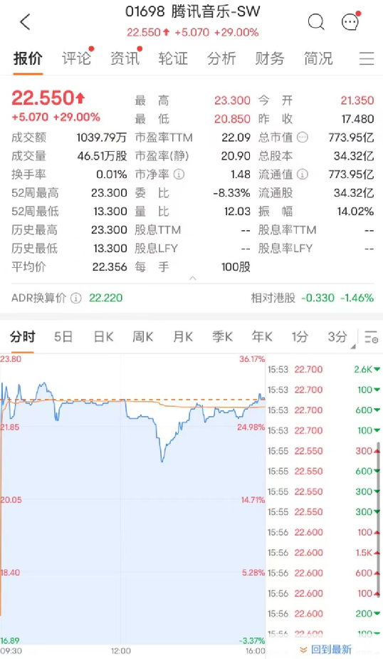 腾讯音乐交出回港上市后的首份财报,报告显示其业绩稳健,腾讯音乐今日一度飙涨超30%,收盘涨幅略回落,收涨29%,报22.55港元/股,最新总市值773.95亿港元。