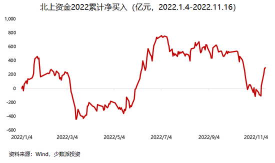 如上图,北上今年经历了两次去而复返,一次在今年的3、4、5月份,另一次在刚刚过去的10月中旬-11月中旬,出现了短暂的净流出。