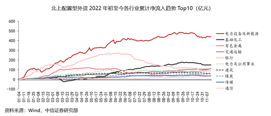 北上虽然如此纠结,一直进进出出。但从结构来看,还是有较为偏爱的行业:根据中信证券对北上资金的拆解,“配置型外资”全年较为偏爱新能源。