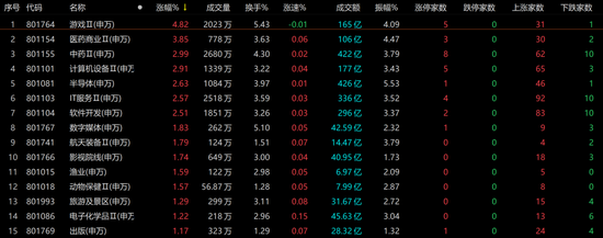 从申万二级行业指数来看,游戏、医药商业、中药、计算机设备、半导体、IT服务、软件开发等行业板块涨幅居前。其中,游戏板块以4.82%的涨幅遥遥领先,霸气领涨。