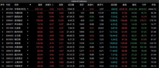 今日半导体行业板块涨幅居前,整体收涨2.63%。板块内个股方面,中晶科技、国民技术涨停,圣邦股份、声光电科涨超6%,江波龙、杨杰科技涨超5%。