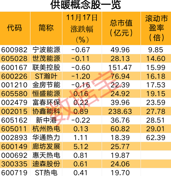 证券时报·数据宝统计,A股中主营业务供暖的概念股较为稀缺,仅15只。11月17日9只概念股上涨,廊坊发展、华通热力、协鑫能科涨幅居前,分别上涨5.12%、1.11%、0.89%。