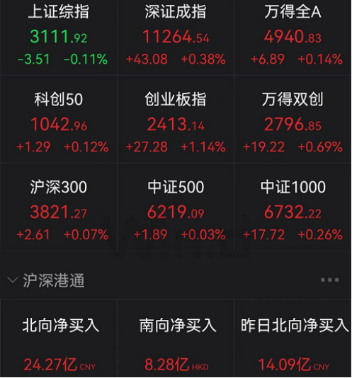 11月18日早盘A股三大指数走势分化,沪指震荡调整,创业板指在宁德时代等赛道股引领下涨逾1%。截至上午收盘,沪指跌0.11%,深成指涨0.38%,创业板指涨1.14%。北向资金早盘净流入24.27亿元,两市半日成交5816亿元。