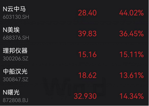 今日上市的四只新股三涨一跌。其中,沪市主板新股N云中马上涨44%,科创板新股N美埃上涨逾36%,北交所新股N曙光涨逾14%,创业板新股N天元宠跌逾7%。