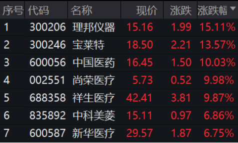 医疗保健板块今日早盘表现突出,位居涨幅前列。理邦仪器、宝莱特涨超10%,尚荣医疗一字涨停,新华医疗、华康医疗等涨超5%,迈瑞医疗涨逾3%。