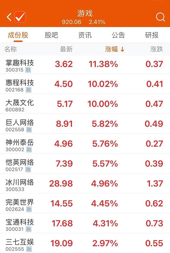 受新一批国产游戏版型号获批消息的提振,网络游戏概念股今日早盘大幅走高。截至午间收盘,掌趣科技上涨逾10%,大晟文化、惠程科技(维权)涨停,巨人网络、三七互娱、吉比特、完美世界等跟涨。